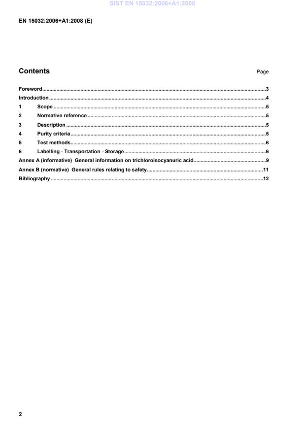 SIST EN 15032:2006+A1:2008 is a European Standard developed by CEN that specifies the requirements for trichloroisocyanuric acid used in the treatment of swimming pool water. This standard applies to the chemical whether used directly or as part of commercial disinfectant formulations. It defines the product’s characteristics, purity criteria, test methods, labelling, storage, handling, and safety requirements.