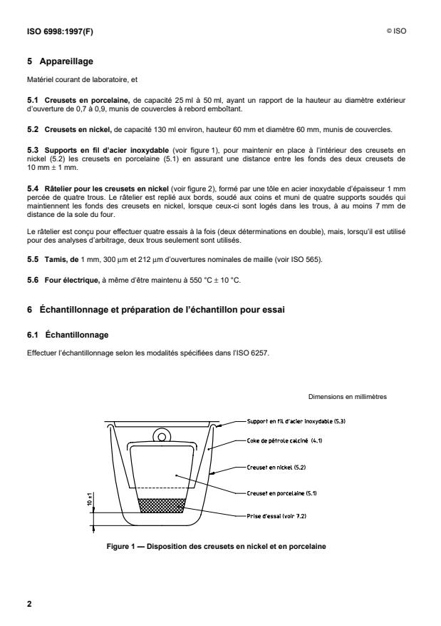 ISO 6998 refers to ISO 6257 for the appropriate sampling techniques. It outlines how to prepare test portions of pitch, including crushing, grinding, or melting soft pitches, ensuring representative and consistent samples for testing.Test Apparatus