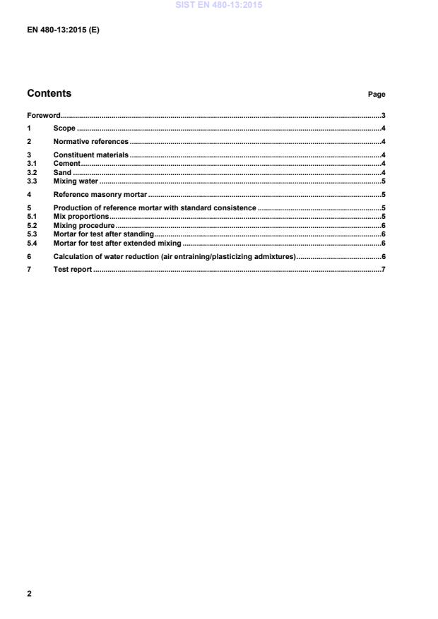 This European Standard specifies the constituent materials, the composition and the mixing procedure to produce a reference masonry mortar with a prescribed consistence for testing mortar admixtures as defined in EN 934-3. It also describes the determination of the water reduction of the test mix compared to the control mix.
