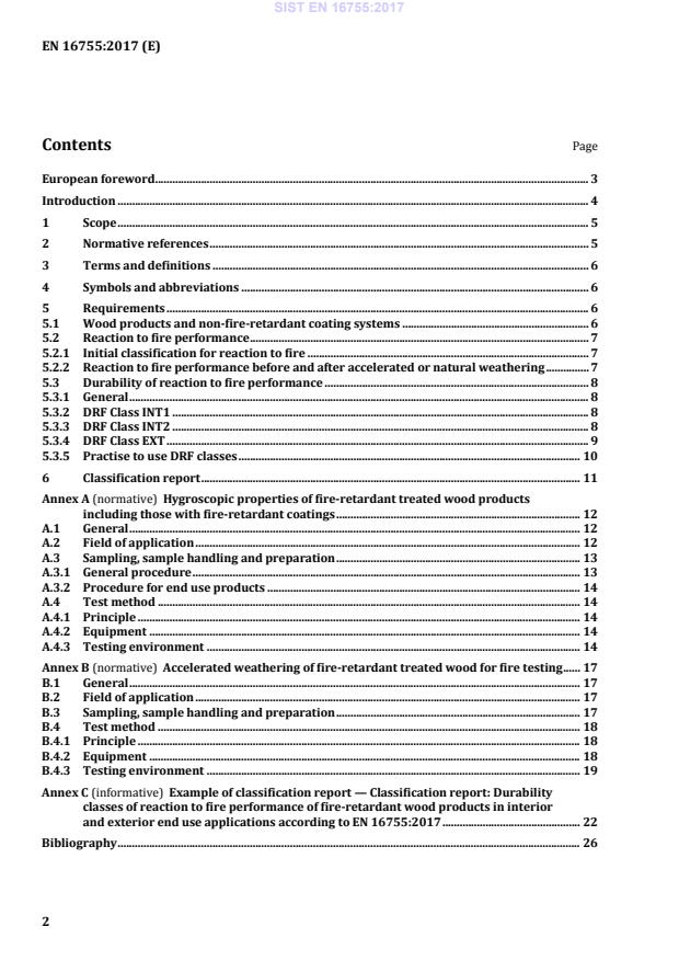 Accelerated weathering of fire-retardant treated wood for fire testing . 17 B.1 General . 17 B.2 Field of application . 17 B.3 Sampling, sample handling and preparation . 17 B.4 Test method . 18 B.4.1 Principle . 18 B.4.2 Equipment . 18 B.4.3 Testing environment . 19 Annex C (informative)