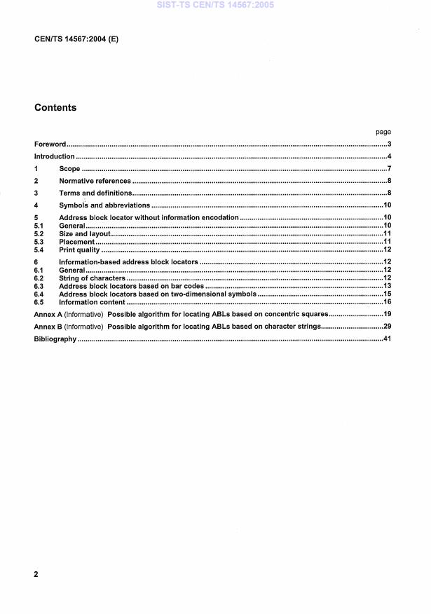 SIST-TS CEN/TS 14567:2005 is a technical specification published by the Slovenian Institute for Standardization (SIST). Its full title is "Postal services - Automated processing of mail items - Address block locator". This standard covers: This Technical Specification defines a set of physical marks called Address Block Locators (ABLs). ABLs are marks, printed in the vicinity of addresses on postal items, that are intended to facilitate automatic recognition of address location and processing of the addresses on mail sorting and video-coding equipment. The Technical Specification describes two families of ABLs which may be printed on all types of postal items, including letters, flats and parcels. In the first family, address block locators take the form of pictograms which bear no other information than being a landmark for the address block. One such pictogram is defined herein for use in association with the delivery address block. It may be printed at the same time as the address or pre-printed on an envelope, an insert, or a label, with the address being printed, on the same physical support, at a later stage. The second family covers address block locators which contain an encoded specification of the address block type and location and which can also be used for encoding other data, not directly related to address block location. Such data may include addressee or postal item identifiers, routing data, non-delivery instructions, a return address and references or other data which are relevant for either the mailer or the addressee. It may also include address checking data which may be used to verify correct interpretation of the printed address by the OCR system. In this family, three types of ABL are defined: one based on a pattern of alphanumeric characters; one on a linear bar code and one based on two-dimensional symbologies. These locators can be applied to the delivery address block and to forwarding or return address blocks. They will normally be printed within the same process as the address itself. The Technical Specification is intended to be used by: - mailers, during the production of mail; (....)