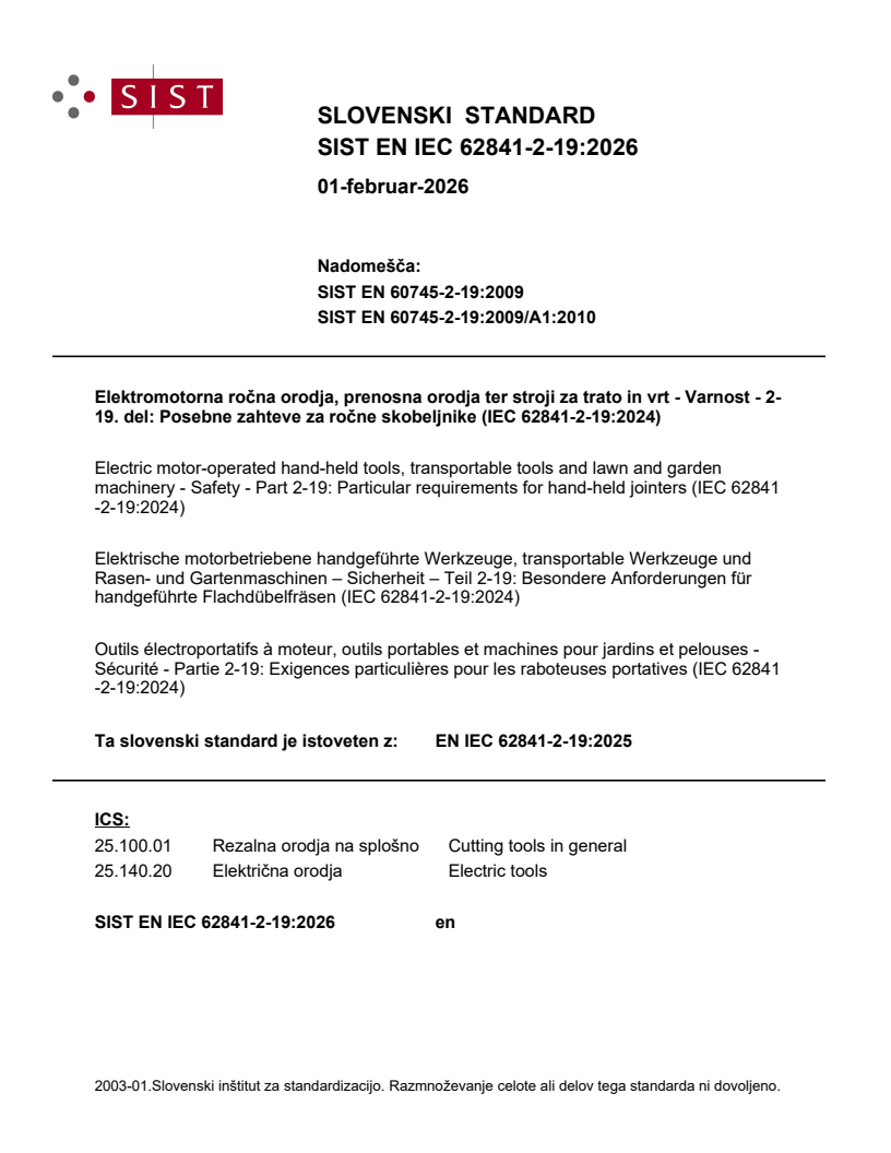 SIST EN IEC 62841-2-19:2026 is a standard published by the Slovenian Institute for Standardization (SIST). Its full title is "Electric motor-operated hand-held tools, transportable tools and lawn and garden machinery - Safety - Part 2-19: Particular requirements for hand-held jointers (IEC 62841-2-19:2024)". This standard covers: This document supplements or modifies the corresponding clauses in IEC 62841-1, so as to convert it into the IEC Standard: Particular requirements for hand-held jointers. IEC 62841-1:2014, Clause 1 is applicable, except as follows: This document applies to hand-held jointers for cutting into wood or materials with similar physical characteristics such as, for example, chipboard, fibreboard and plywood.