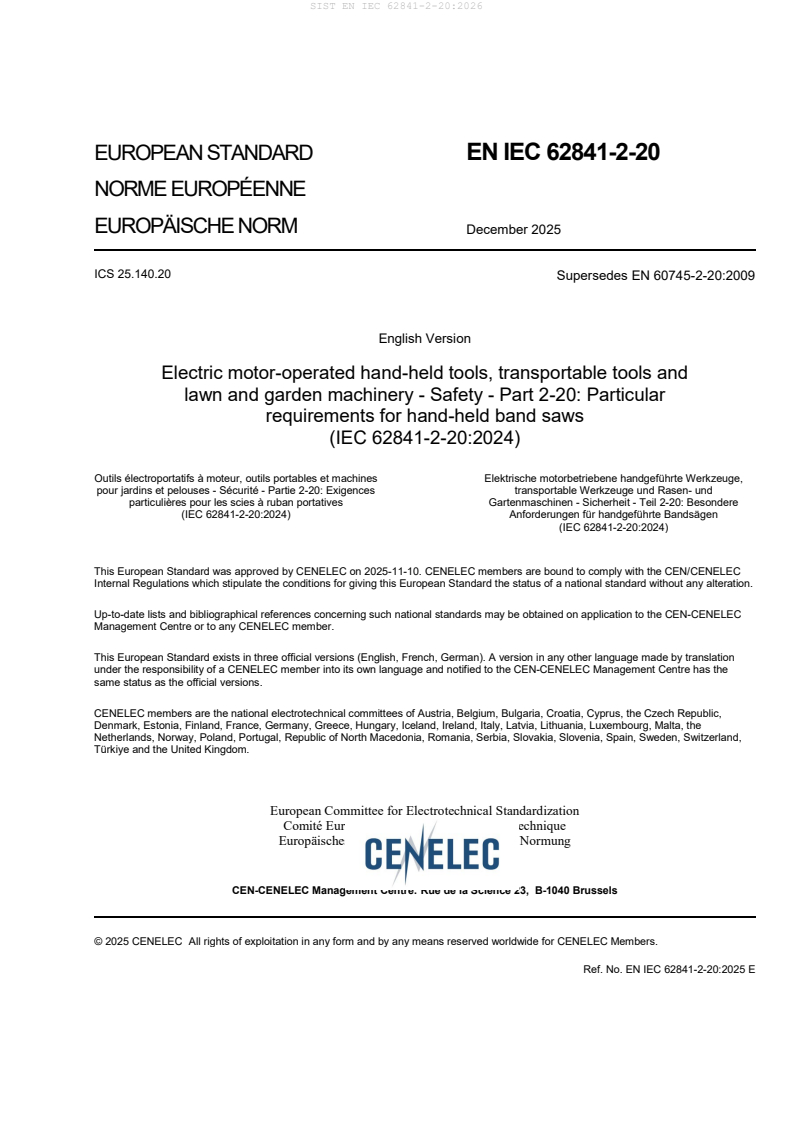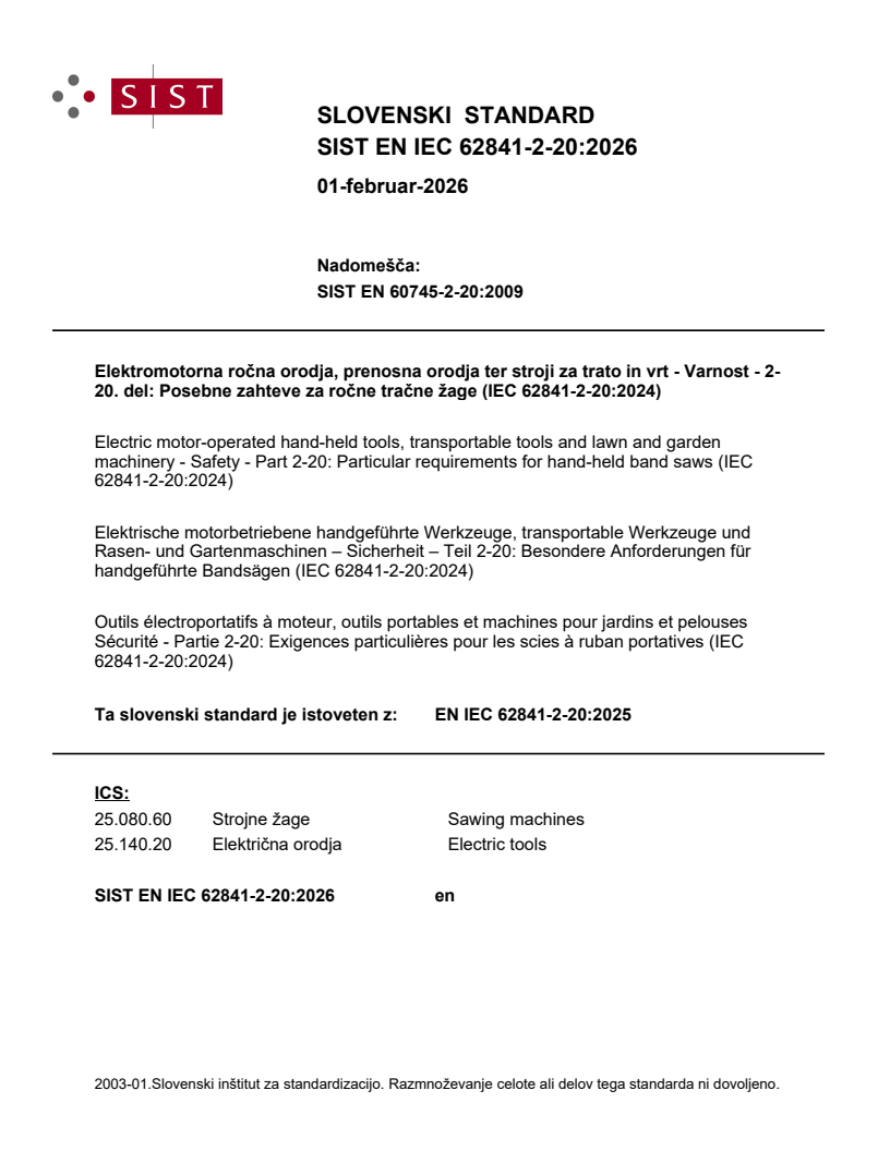 SIST EN IEC 62841-2-20:2026 is a standard published by the Slovenian Institute for Standardization (SIST). Its full title is "Electric motor-operated hand-held tools, transportable tools and lawn and garden machinery - Safety - Part 2-20: Particular requirements for hand-held band saws (IEC 62841-2-20:2024)". This standard covers: This document supplements or modifies the corresponding clauses in IEC 62841-1, so as to convert it into the IEC Standard: Particular requirements for hand-held band saws. Where a particular subclause of IEC 62841-1 is not mentioned in this document, that subclause applies as far as reasonable. Where this document states "addition", "modification" or "replacement", the relevant text in IEC 62841-1 is to be adapted accordingly. IEC 62841-1:2014, Clause 1 is applicable, except as follows: This document applies to hand-held band saws.