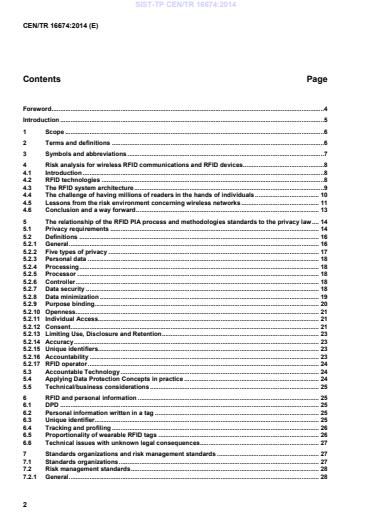 Področje uporabe tega tehničnega poročila je določevanje metodologij, ki se uporabljajo ali se obravnavajo kot ustrezne za uporabo z brezžičnimi tehnologijami. Z analizo teh metodologij se določi lastnosti, ki veljajo za RFID. Na podlagi industrijskega ogrodja ocenjevanja vpliva RFID na zasebnost, ki ga določa člen 29 Delovne skupine za varstvo podatkov, tehnično poročilo predvsem predlaga metodologije analize tveganja, ki so ustrezne za področje zajema podatkov v sistemu RFID. To vključuje oznako RFID, bralnik, protokol radijskega vmesnika, ki se uporablja za komunikacijo med njima, in komunikacijo med bralnikom in aplikacijo. Tehnično poročilo predlaga tudi lastnosti obvladovanja tveganja, ki temeljijo na zmogljivosti številnih tehnologij RFID, ki so v skladu s standardiziranimi protokoli radijskega vmesnika RFID. To naj bi zagotovilo dovolj informacij, ki bi omogočile, da se predlagane lastnosti nadzora zasebnosti uporabijo v drugih tehnologijah RFID, vključno s tistimi, ki imajo lastniške protokole radijskega vmesnika in arhitekture oznak. Lastnosti obvladovanja tveganja ne zajemajo temeljnih vgrajenih lastnosti, ker naj bi bile te predmet popravkov in izboljšav tehnoloških standardov. Lastnosti obvladovanja tveganja, ki jih določa to tehnično poročilo, se uporabljajo za dejanske in prihodnje uporabe RFID, ki temeljijo na obstoječi tehnologiji. Tako je to tehnično poročilo prispevek k standardnemu postopku za oceno vpliva RFID na zasebnost.