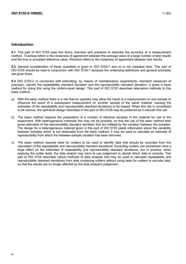 ISO 5725-5:1998 is Part 5 of the ISO 5725 series on the accuracy (trueness and precision) of measurement methods and results. It specifies alternative methods to the basic interlaboratory design for determining the precision (repeatability and reproducibility) of a standard measurement method. The part complements ISO 5725-1 and ISO 5725-2 by providing experimental designs and robust statistical approaches for situations in which the basic uniform‑level design is not optimal.