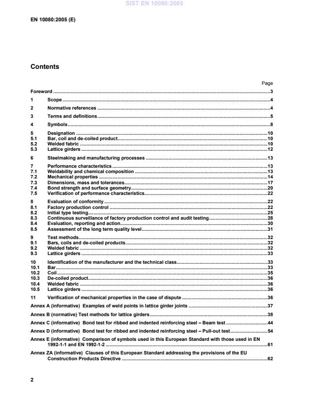 diagonals (Ps) of a lattice girder 6 Steelmaking and manufacturing processes 6.1 The melting process and type of de-oxidation of the steel is at the discretion of the steel producer. 6.2 The manufacturing process for the production of coils and bars is at the discretion of the manufacturer. It shall be reported to the purchaser if requested. 6.3 De-coiling of coil material shall be done by a machine made for this purpose. 6.4 The manufacture of reinforcing steel by re-rolling finished products (e.g. sheets or rails) is not permitted. 6.5 All welded fabric shall be factory made and machine welded. The joints, at the intersection of the longitudinal wires and the transverse wires, shall be made by electrical resistance welding, to provide a specified shear resistance. Welded fabric may be composed of a different technical class in each direction. Twin wire welded fabric shall be composed of twin wires in only one direction. 6.6 All lattice girders shall be factory made, and may be made from bars and coils or strip (for upper chords only). The joints between chords and diagonals shall be made by electrical resistance welding, or by mechanical clamping, to provide a specified shear resistance. 7 Performance characteristics 7.1 Weldability and chemical composition 7.1.1 Weldability is determined by two characteristics: carbon equivalent; SIST EN 10080:2005
