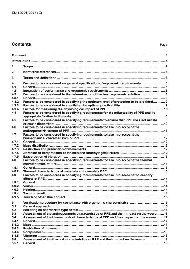 1 Scope This European Standard provides guidance on the generic ergonomic characteristics related to personal protective equipment (PPE). It specifies for the writers of PPE product standards, principles relating to: anthropometric characteristics related to PPE; the biomechanical interaction between PPE and the human body; the thermal interaction between PPE and the human body; the interaction between PPE and the human senses: vision; hearing; smell and taste; and skin contact. This European Standard does not cover requirements related to the specific hazard for which PPE is designed. 2 Normative references The following referenced documents are indispensable for the application of this document. For dated references, only the edition cited applies. For undated references, the latest edition of the referenced document (including any amendments) applies. EN ISO 12894, Ergonomics of the thermal environment — Medical supervision of individuals exposed to extreme hot or cold environments (ISO 12894:2001) 3 Terms and definitions For the purposes of this European Standard, the following terms and definitions apply. 3.1 anthropometrics of PPE application of human body measurements to the design of PPE including variation in dimensions within the user group 3.2 auditory aspects qualities which interfere with the users ability to hear 3.3 biomechanics of PPE application of principles and methods from physics and engineering to describe the effect undergone by the human body and various body segments and the forces acting on these body segments including physical loading which may be caused by PPE 3.4 body heat balance increase or decrease in the heat content of the body caused by an imbalance between heat production and heat loss, usually expressed in terms of unit area of total body surfaces