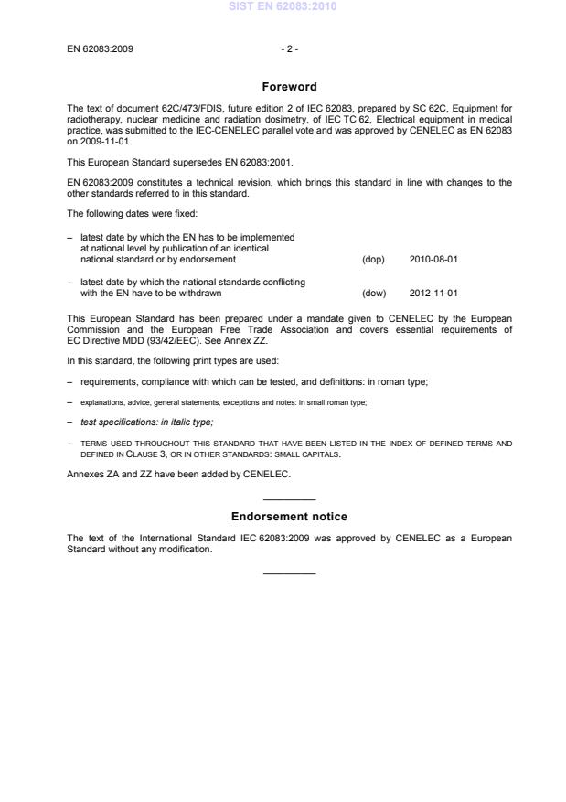 SIST EN 62083:2010 is a standard published by the Slovenian Institute for Standardization (SIST). Its full title is "Medical electrical equipment - Requirements for the safety of radiotherapy treatment planning systems (IEC 62083:2009)". This standard covers: IEC 62083:2009 applies to the design, manufacture and some installation aspects of a radiotherapy treatment planning systems: - for use in radiotherapy treatment planning in human medical practice; - that imports data either through input by the operator or directly from other devices; - that outputs data either in printed form for review or directly to other devices; and which is intended to be: a) for normal use, under the authority of appropriately licensed or qualified persons, by operators having the required skills and training; b) maintained in accordance with the recommendations given in the instructions for use, and c) used within the environmental and electrical supply conditions specified in the technical description. This second edition replaces the first edition of IEC 62083, published in 2000. This edition constitutes a technical revision, which brings this standard in line with changes to the other standards referred to in this standard.