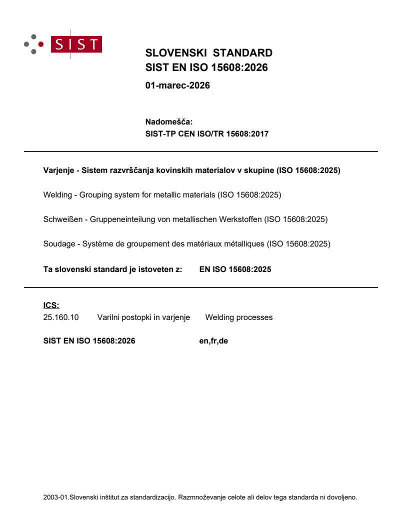 Varjenje - Sistem razvrščanja kovinskih materialov v skupine (ISO 15608:2025)