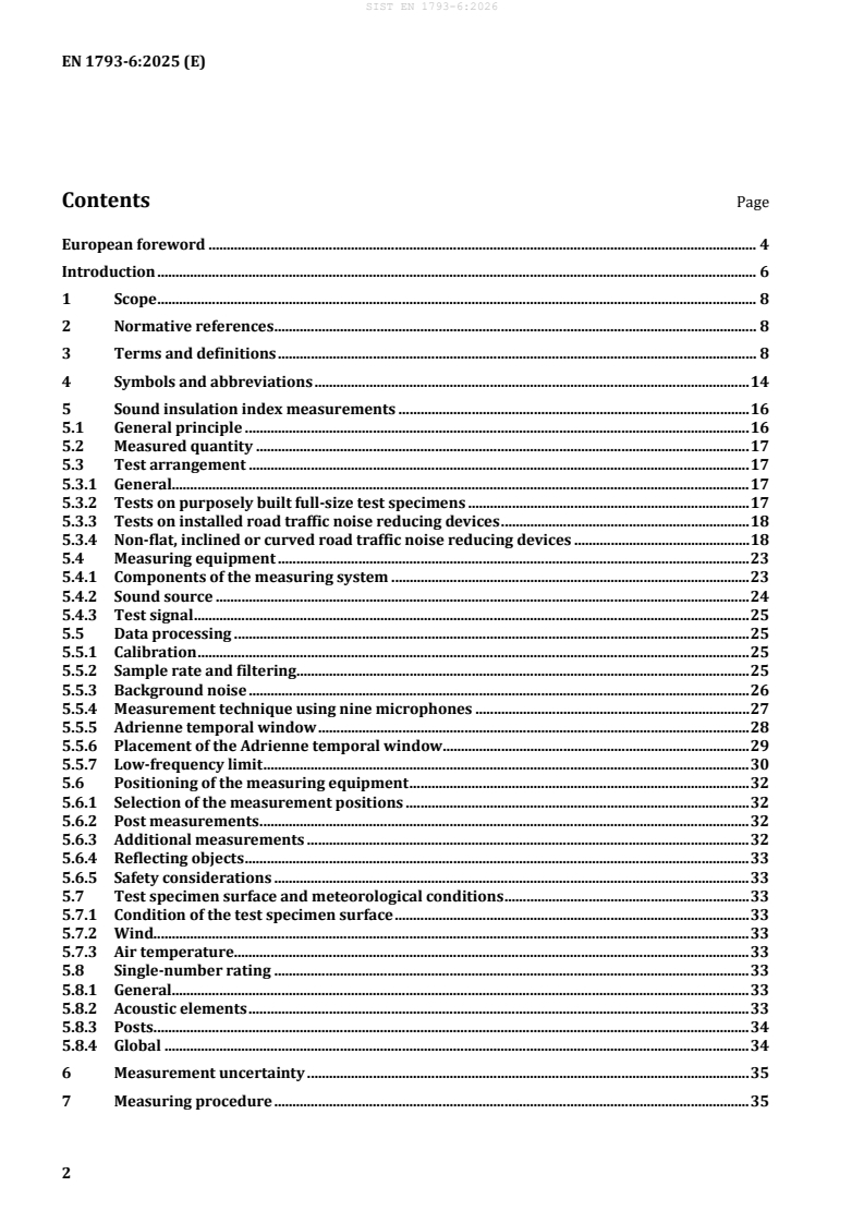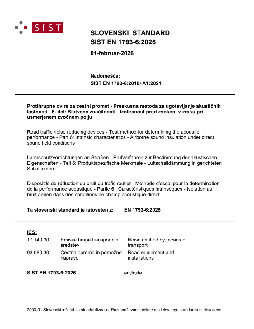SIST EN 1793-6:2026 is a standard published by the Slovenian Institute for Standardization (SIST). Its full title is "Road traffic noise reducing devices - Test method for determining the acoustic performance - Part 6: Intrinsic characteristics - Airborne sound insulation under direct sound field conditions". This standard covers: This document specifies a test method for measuring a quantity representative of the intrinsic characteristics of airborne sound insulation for road traffic noise reducing devices: the sound insulation index. This document is applicable to: — determination of the intrinsic characteristics of airborne sound insulation of noise reducing devices to be installed along roads, to be measured either on typical installations alongside roads or in laboratory conditions; — determination of the intrinsic characteristics of airborne sound insulation of road traffic noise reducing devices in actual use; — comparison of design specifications with actual performance data after the completion of the construction work; — verification of the long-term performance of road traffic noise reducing devices (with a repeated application of the method); — interactive design process of new products, including the formulation of installation manuals. This document does not apply to: — the determination of the intrinsic characteristics of airborne sound insulation of road traffic noise reducing devices to be installed in reverberant conditions, e.g. inside tunnels or deep trenches or under covers. Results for the sound insulation index are expressed as a function of frequency in one-third octave bands, between 200 Hz and 5 kHz for qualification purposes. If it is not possible to get valid measurement results over the whole frequency range indicated, the results are given in a restricted frequency range and the reasons for the restriction(s) are clearly reported. For indoor measurements, see Annex D.
