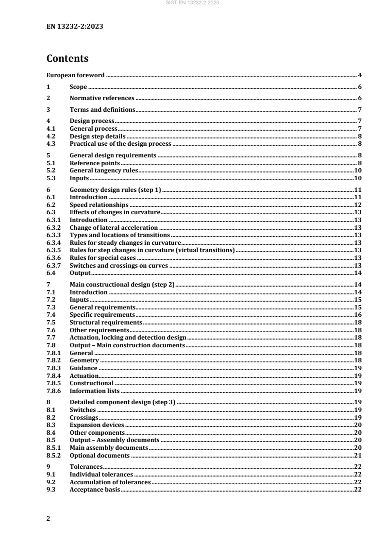 This document: — establishes the design process for switches and crossings (S&C), and the use of the other parts of this standard; — specifies the geometric design principles for wheel guidance; — establishes the basic limits of supply; — establishes the applied forces and their adequate support; — specifies tolerance levels. These are illustrated herein by application to a turnout. The main switch and crossing components are represented in turnouts and the principles used in turnouts apply equally to more complex layouts.