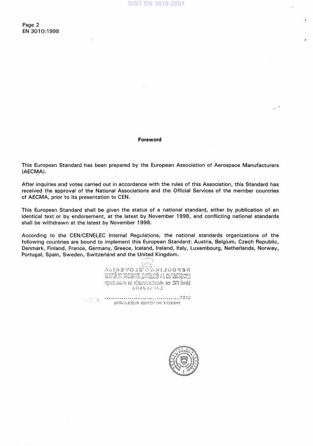 SIST EN 3010:2001 is a standard published by the Slovenian Institute for Standardization (SIST). Its full title is "Aerospace series - Bolts, hexagon head, relieved shank, long thread, in heat resisting nickel base alloy NI-P101HT (Waspaloy) - Classification: 1 210 MPa (at ambient temperature)/730 °C". This standard covers: This standard specifies the characteristics of hexagon headed bolts with relieved shank and long thread, in NI-P101HT, for aerospace applications. Classification: 1 210 MPa/730 °C.