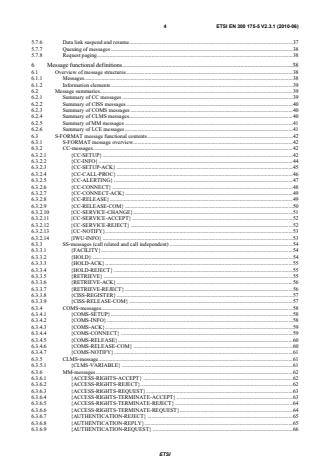 ETSI ETSI EN 300 175-5 V2.3.1 (2010-06) 4 5.7.6 Data link suspend and resume. 37 5.7.7 Queuing of messages . 38 5.7.8 Request paging . 38 6 Message functional definitions . 38 6.1 Overview of message structures . 38 6.1.1 Messages . 38 6.1.2 Information elements . 39 6.2 Message summaries . 39 6.2.1 Summary of CC messages . 39 6.2.2 Summary of CISS messages . 40 6.2.3 Summary of COMS messages . 40 6.2.4 Summary of CLMS messages . 40 6.2.5 Summary of MM messages . 41 6.2.6 Summary of LCE messages . 41 6.3 S-FORMAT message functional contents . 42 6.3.1 S-FORMAT message overview . 42 6.3.2 CC-messages. 42 6.3.2.1 {CC-SETUP} . 42 6.3.2.2 {CC-INFO} . 44 6.3.2.3 {CC-SETUP-ACK} . 45 6.3.2.4 {CC-CALL-PROC} . 46 6.3.2.5 {CC-ALERTING} . 47 6.3.2.6 {CC-CONNECT} . 48 6.3.2.7 {CC-CONNECT-ACK} . 49 6.3.2.8 {CC-RELEASE} . 49 6.3.2.9 {CC-RELEASE-COM} . 50 6.3.2.10 {CC-SERVICE-CHANGE} . 51 6.3.2.11 {CC-SERVICE-ACCEPT} . 52 6.3.2.12 {CC-SERVICE-REJECT} . 52 6.3.2.13 {CC-NOTIFY}. 53 6.3.2.14 {IWU-INFO} . 53 6.3.3 SS-messages (call related and call independent) . 54 6.3.3.1 {FACILITY} . 54 6.3.3.2 {HOLD} . 54 6.3.3.3 {HOLD-ACK} . 55 6.3.3.4 {HOLD-REJECT} . 55 6.3.3.5 {RETRIEVE} . 55 6.3.3.6 {RETRIEVE-ACK} . 56 6.3.3.7 {RETRIEVE-REJECT} . 56 6.3.3.8 {CISS-REGISTER} . 57 6.3.3.9 {CISS-RELEASE-COM} . 57 6.3.4 COMS-messages . 58 6.3.4.1 {COMS-SETUP} . 58 6.3.4.2 {COMS-INFO} . 58 6.3.4.3 {COMS-ACK} . 59 6.3.4.4 {COMS-CONNECT} . 59 6.3.4.5 {COMS-RELEASE} . 60 6.3.4.6 {COMS-RELEASE-COM} . 60 6.3.4.7 {COMS-NOTIFY}. 61 6.3.5 CLMS-message . 61 6.3.5.1 {CLMS-VARIABLE} . 61 6.3.6 MM-messages . 62 6.3.6.1 {ACCESS-RIGHTS-ACCEPT} . 62 6.3.6.2 {ACCESS-RIGHTS-REJECT} . 62 6.3.6.3 {ACCESS-RIGHTS-REQUEST} . 63 6.3.6.4 {ACCESS-RIGHTS-TERMINATE-ACCEPT} . 63 6.3.6.5 {ACCESS-RIGHTS-TERMINATE-REJECT} . 64 6.3.6.6 {ACCESS-RIGHTS-TERMINATE-REQUEST} . 64 6.3.6.7 {AUTHENTICATION-REJECT} . 65 6.3.6.8 {AUTHENTICATION-REPLY} . 65 6.3.6.9 {AUTHENTICATION-REQUEST} . 66 SIST EN 300 175-5 V2.3.1:2010