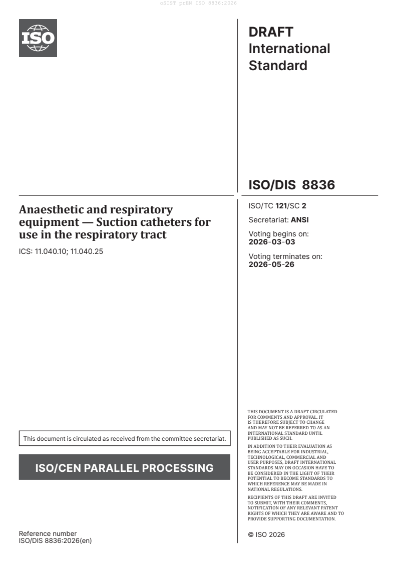 Anaesthetic and respiratory equipment - Suction catheters for use in the respiratory tract (ISO/DIS 8836:2026)