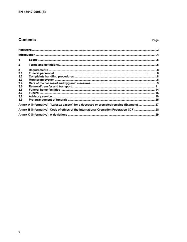 EN 15017:2005 is a standard published by the European Committee for Standardization (CEN). Its full title is "Funeral Services - Requirements". This standard covers: This European Standard sets out the requirements for the provision of funeral services. This European Standard does not apply to product-related technical requirements. Occupational health and safety requirements are not covered by this European Standard.