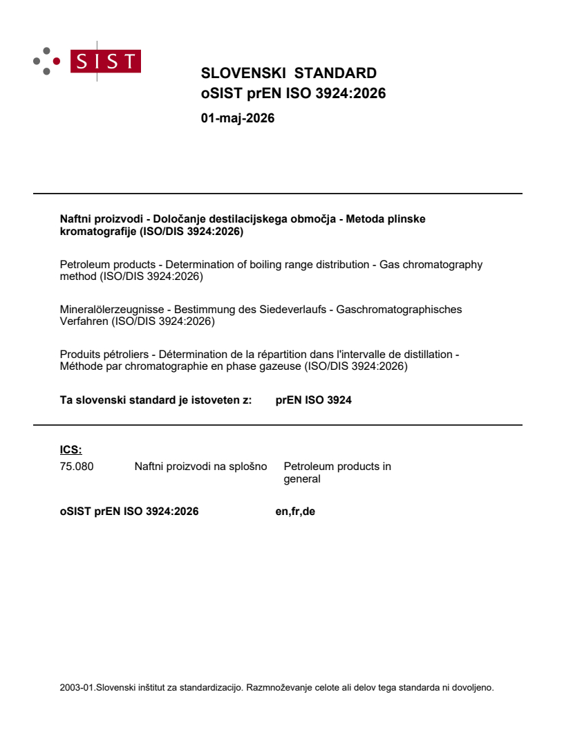 Naftni proizvodi - Določanje destilacijskega območja - Metoda plinske kromatografije (ISO/DIS 3924:2026)