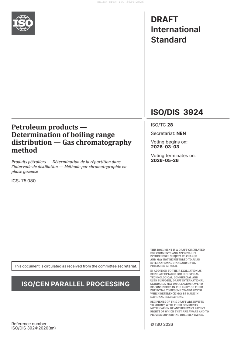(Main)Petroleum products - Determination of boiling range distribution - Gas chromatography method (ISO/DIS 3924:2026)