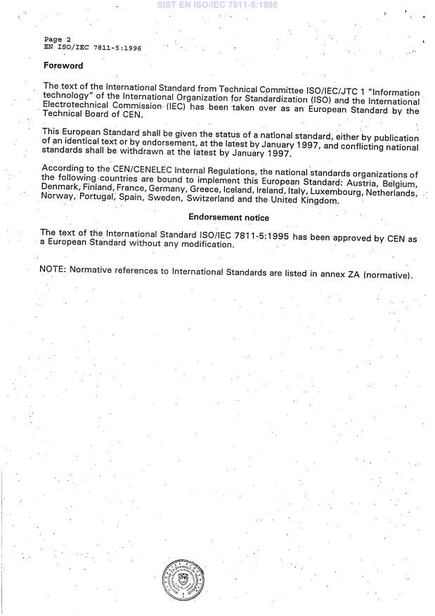 EN ISO/IEC 7811-5:1996 has the following relationships with other standards: It is inter standard links to EN ISO 10366-2:2003, EN ISO 6402-2:2003, EN ISO 2580-2:2003, EN ISO 19065-2:2019, EN ISO 19062-2:2019, EN ISO 19064-2:2020, EN ISO 4894-2:1999, EN ISO 19066-2:2020. Understanding these relationships helps ensure you are using the most current and applicable version of the standard.