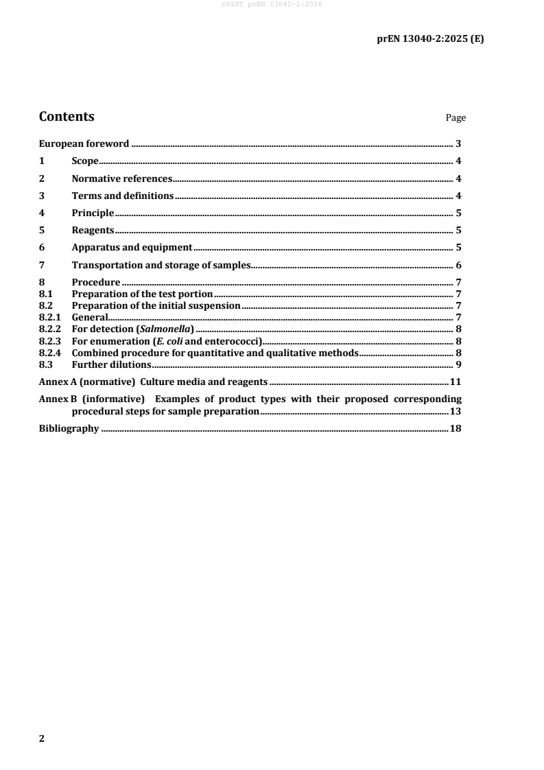 prEN 13040-2 is a draft published by the European Committee for Standardization (CEN). Its full title is "Soil improvers and growing media - Sample preparation - Part 2: Sample preparation for microbiological examination". This standard covers: This document specifies the general requirements for the preparation of samples, initial suspensions and further dilutions prior to microbiological examinations of soil improvers and growing media. This method is intended especially for sample preparation prior to microbiological examinations of e.g. Escherichia coli (E. coli), Salmonella spp. and enterococci. If a laboratory receives a material/product that is not listed in Annex B but has external characteristics (i.e. hardness, fibrous nature, particle size) like one of the materials/products listed in Annex B, then the procedural steps for sample preparation (pre-treatment, treatment and dilution) are carried out in the same way as listed for the material/product which has comparable external characteristics. Any special diluents or practices required for particular materials or microorganisms in specific standard methods take priority over the general requirements listed in this document.