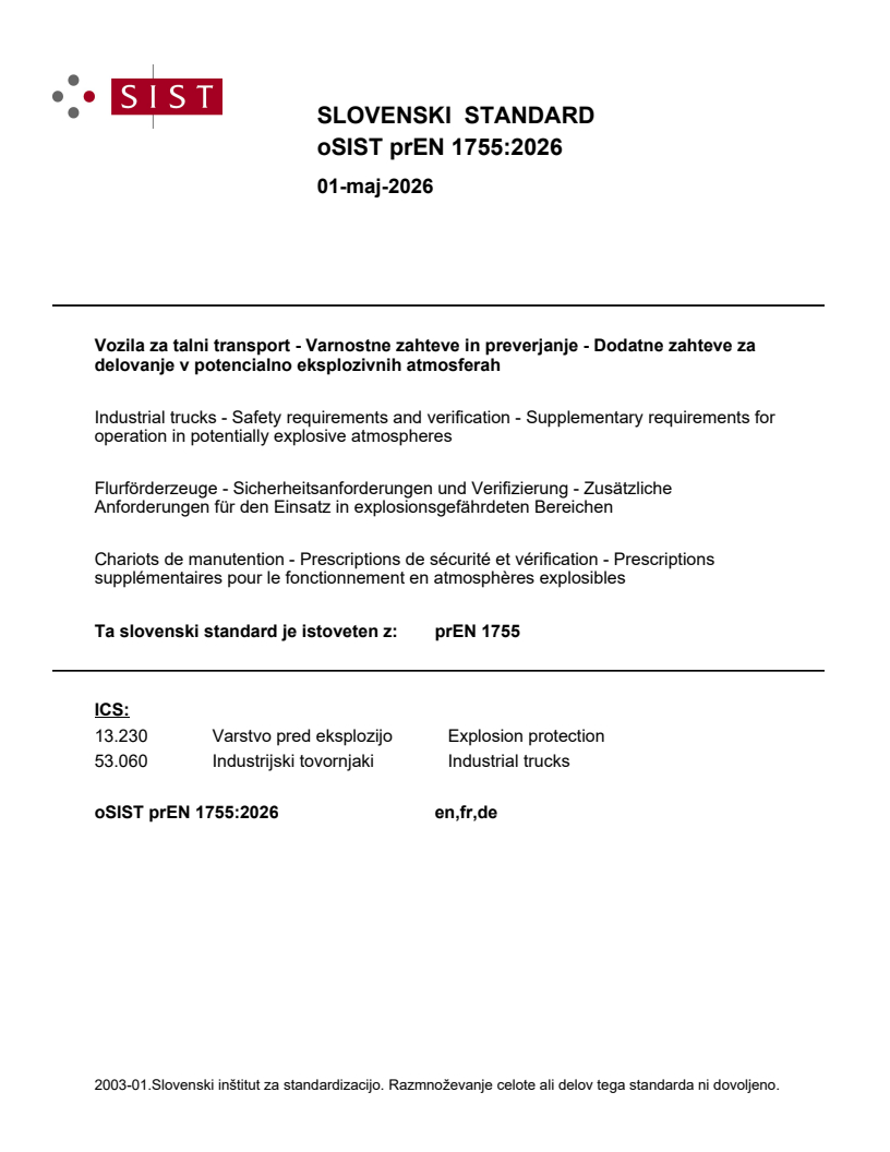 prEN 1755 is a draft published by the European Committee for Standardization (CEN). Its full title is "Industrial trucks - Safety requirements and verification - Supplementary requirements for operation in potentially explosive atmospheres". This standard covers: This document is applicable to self-propelled and pedestrian propelled manual and semi-manual industrial trucks as defined in ISO 5053 1:2020 including their load handling devices and attachments (hereafter referred to as trucks) intended for use in potentially explosive atmospheres. NOTE 1 Attachments mounted on the load carrier or on fork arms which are removable by the user are not considered to be a part of the truck. This document specifies supplementary technical requirements for the prevention of the ignition of an explosive atmosphere of flammable gases, vapours, mists or dusts by industrial trucks of equipment group II and equipment category 2G, 3G, 2D or 3D. NOTE 2 The relationship between an equipment category (hereafter referred to as category) and the corresponding zone (area classification) is shown in informative Annex B. This document does not apply to: — trucks of equipment group I; — trucks of equipment group II, equipment category 1; — trucks intended for use in potentially explosive atmospheres with hybrid mixtures; — protective systems. This document does not apply to trucks intended for use in potentially explosive atmospheres of carbon disulfide (CS2), carbon monoxide (CO) and/or ethylene oxide (C2H4O) due to the special properties of these gases. Technical requirements relating to lithium-ion batteries and fuel cells as energy sources are not given in this document due to their specific hazards.