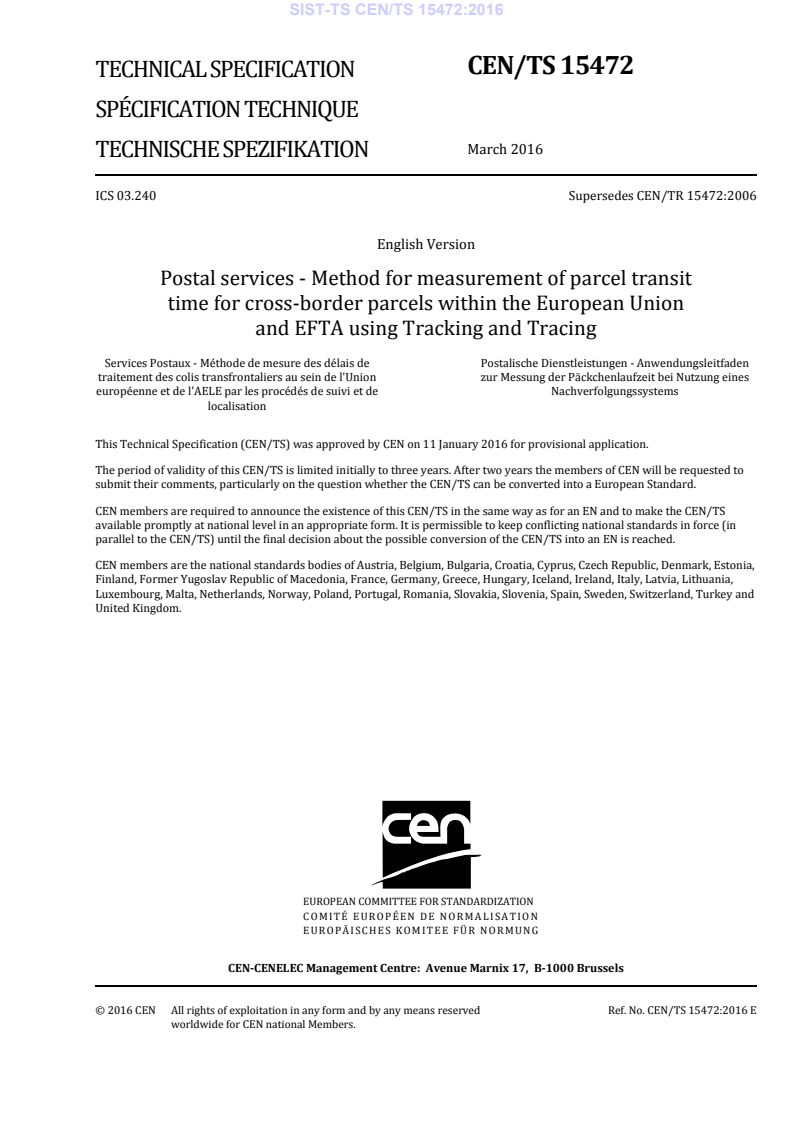 Keywords: CEN/TS 15472:2016, parcel transit time, cross‑border parcels, tracking and tracing, proof of acceptance (POA), first valid attempt of delivery, e‑merchant, SME, EU, EFTA.