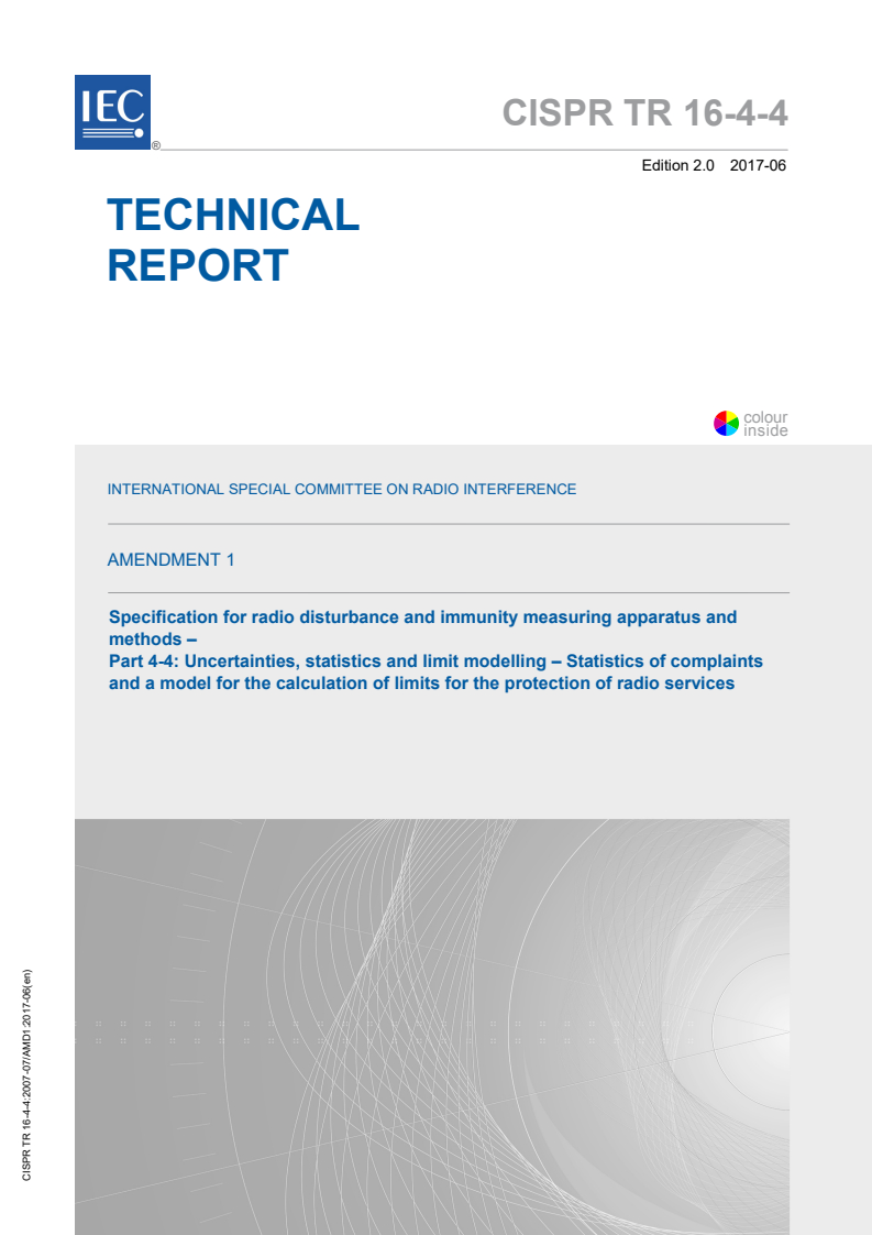 CISPR TR 16-4-4:2007/AMD1:2017 is a technical report published by the International Electrotechnical Commission (IEC). Its full title is "Amendment 1 - Specification for radio disturbance and immunity measuring apparatus and methods - Part 4-4: Uncertainties, statistics and limit modelling - Statistics of complaints and a model for the calculation of limits for the protection of radio services". This standard covers: Amendment 1 - Specification for radio disturbance and immunity measuring apparatus and methods - Part 4-4: Uncertainties, statistics and limit modelling - Statistics of complaints and a model for the calculation of limits for the protection of radio services