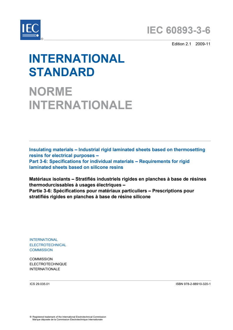 IEC 60893-3-6:2003+AMD1:2009 CSV - Insulating materials - Industrial rigid laminated sheets based on thermosetting resins for electrical purposes - Part 3-6: Specifications for individual materials - Requirements for rigid laminated sheets based on silicone resins Released:11/10/2009