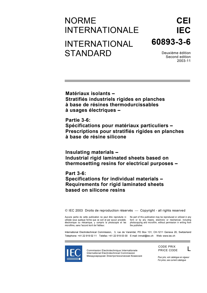 IEC 60893-3-6:2003 is a standard published by the International Electrotechnical Commission (IEC). Its full title is "Insulating materials - Industrial rigid laminated sheets based on thermosetting resins for electrical purposes - Part 3-6: Specifications for individual materials - Requirements for rigid laminated sheets based on silicone resins". This standard covers: Gives the requirements for industrial rigid laminated sheets for electrical purposes based on silicone resins and different reinforcements. Applications and distinguishing properties are given. Materials which conform to this specification meet established levels of performance. However, the selection of a material by a user for a specific application should be based on the actual requirements necessary for adequate performance in that application and not based on this specification alone. In this revision of the IEC 60893 series of specifications, new material types have been included, changes have been made to the property requirements of some existing types, a new method for testing permittivity and dissipation factor has been added, and all non-specification data for each type has been moved to a new Part 4 document - IEC 60893-4: Typical values.