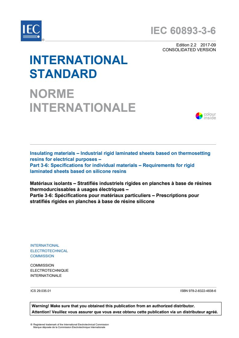 IEC 60893-3-6:2003+AMD1:2009+AMD2:2017 CSV - Insulating materials - Industrial rigid laminated sheets based on thermosetting resins for electrical purposes - Part 3-6: Specifications for individual materials - Requirements for rigid laminated sheets based on silicone resins Released:9/15/2017