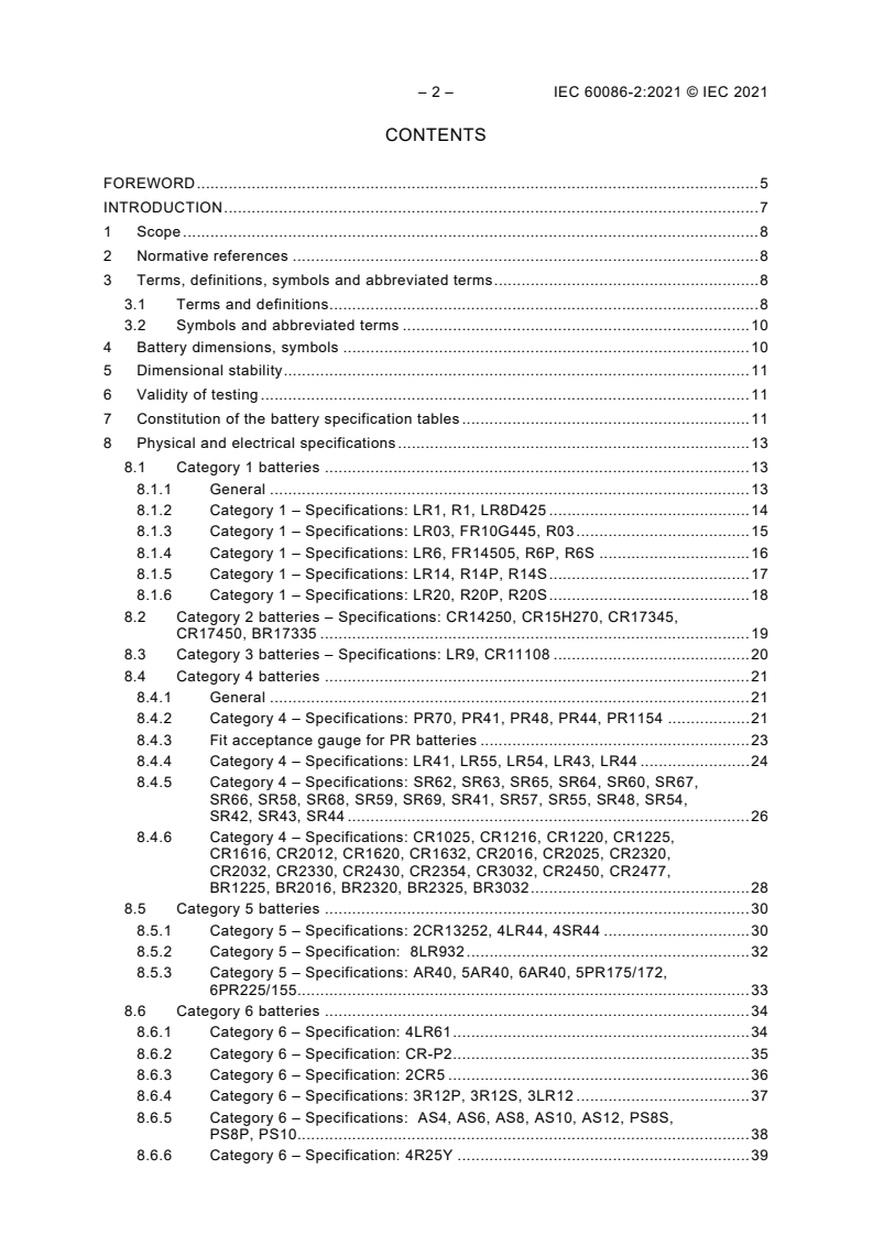 IEC 60086-2:2021 is a standard published by the International Electrotechnical Commission (IEC). Its full title is "Primary batteries - Part 2: Physical and electrical specifications". This standard covers: CORRECTED VERSION 2026-03 IEC 60086-2:2021 is applicable to primary batteries which are based on standardised electrochemical systems. It specifies – the physical dimensions, – the discharge test conditions and discharge performance requirements. The contents of the corrigenda 1 (2022-06) and 2 (2026-03) have been included in this copy.