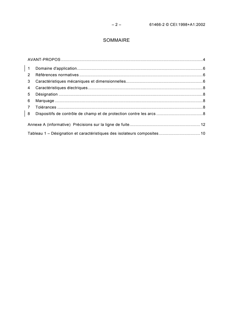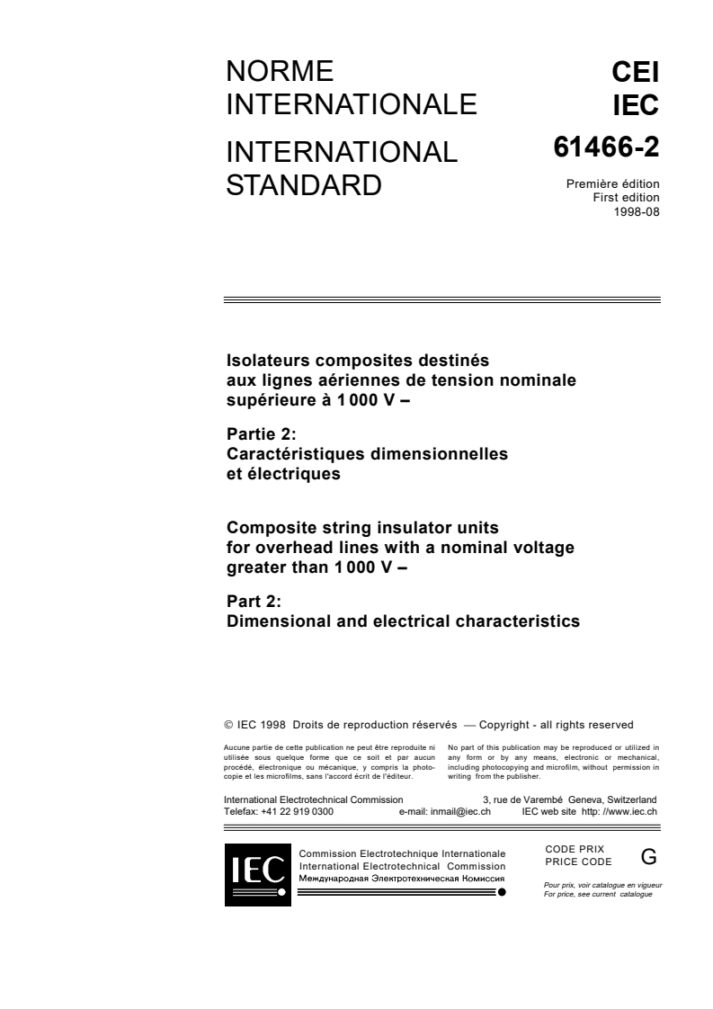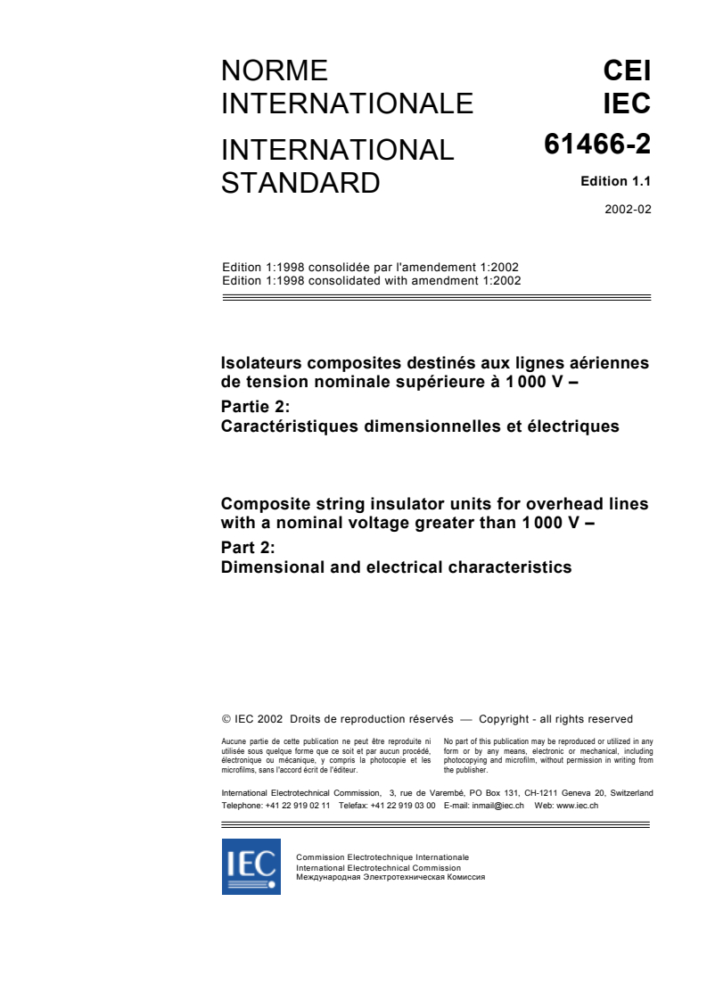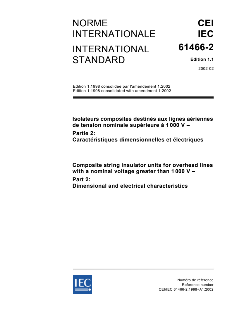 IEC 61466-2:1998 is a standard published by the International Electrotechnical Commission (IEC). Its full title is "Composite string insulator units for overhead lines with a nominal voltage greater than 1 000 V - Part 2: Dimensional and electrical characteristics". This standard covers: Is applicable to composite string insulators with a specified mechanical load (SML) of 40 kN and 70 kN for a.c. overhead distribution lines with a nominal voltage greater than 1 000 V and a frequency not greater than 100 Hz. It also applies to insulators of similar design used in substations or on electric traction lines.
