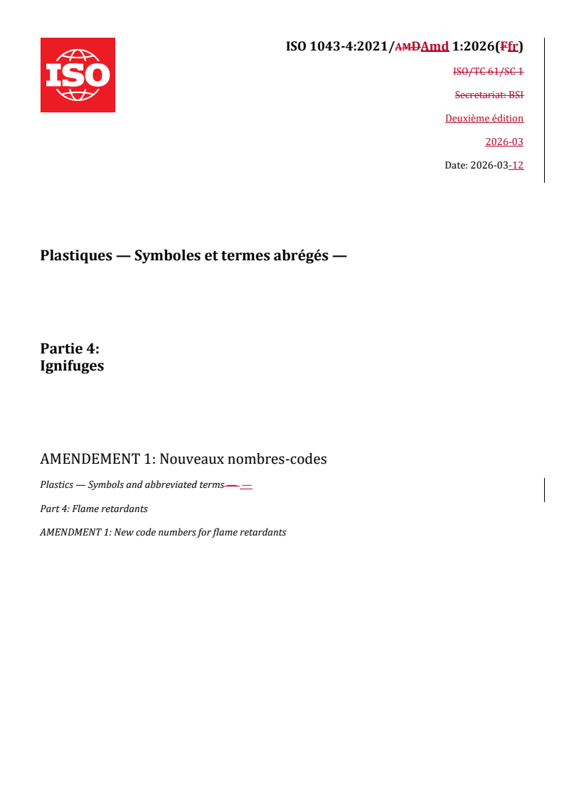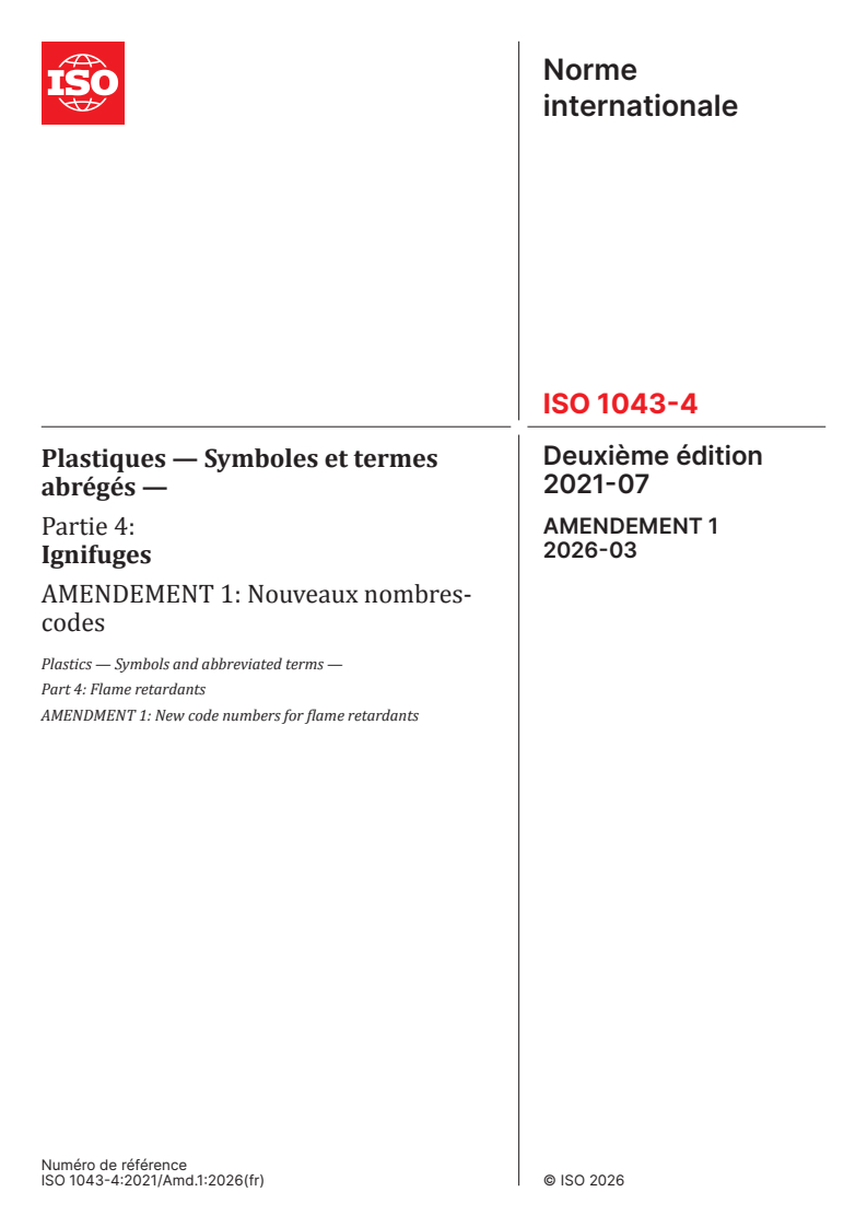 ISO 1043-4:2021/Amd 1:2026 - Plastiques — Symboles et termes abrégés — Partie 4: Ignifuges — Amendement 1: Nouveaux nombres-codes