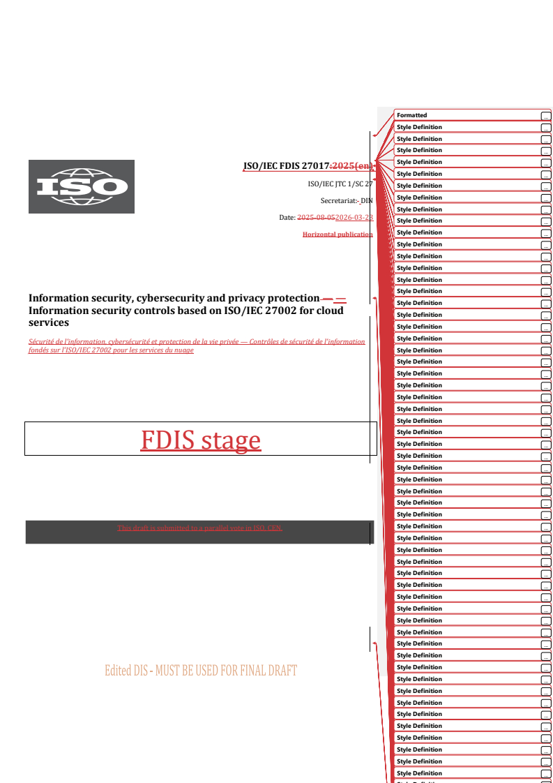 REDLINE ISO/IEC FDIS 27017 - Information security, cybersecurity and privacy protection — Information security controls based on ISO/IEC 27002 for cloud services