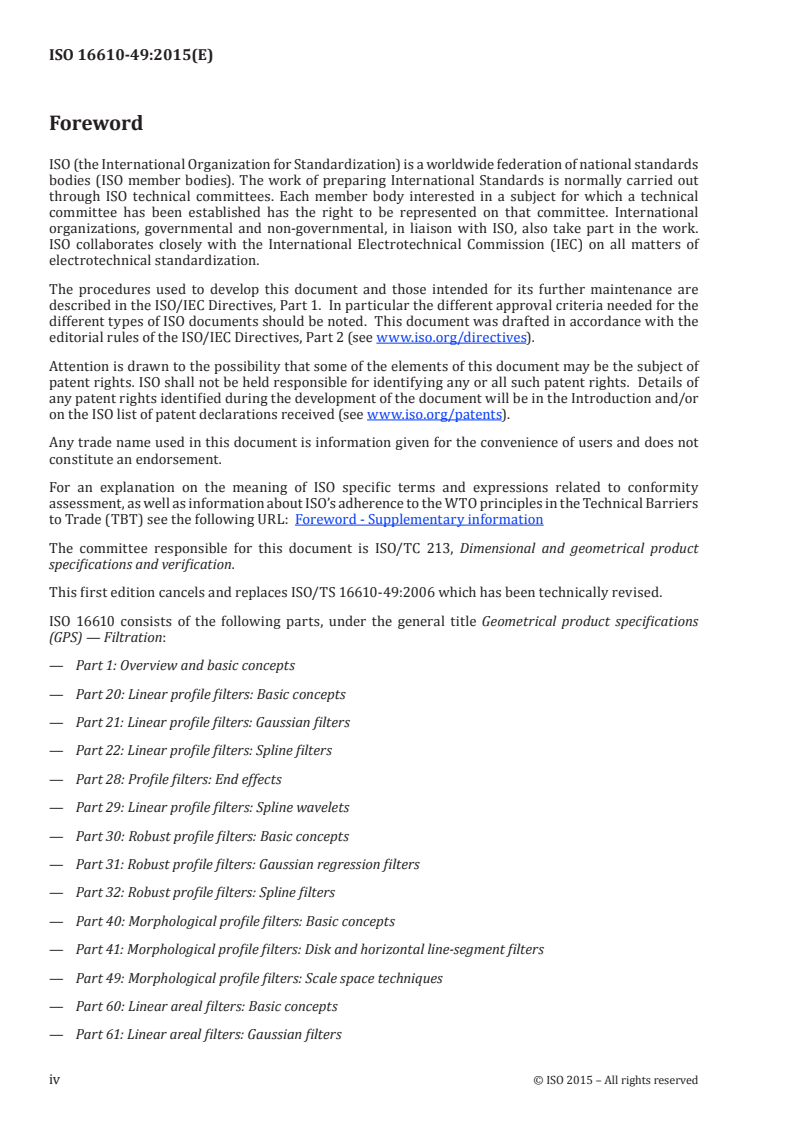 ISO 16610-49:2015 is a standard published by the International Organization for Standardization (ISO). Its full title is "Geometrical product specifications (GPS) — Filtration — Part 49: Morphological profile filters: Scale space techniques". This standard covers: ISO 16610-49:2015 specifies morphological scale space techniques. The basic terminology for scale space techniques is given together with their usage.