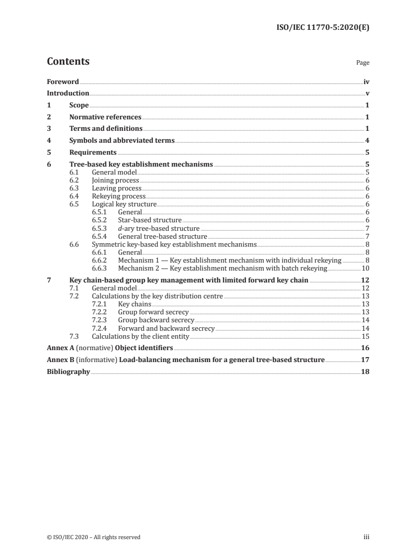 Keywords: ISO/IEC 11770-5:2020, group key management, KDC, tree-based key establishment, key chain, group forward secrecy, group backward secrecy, rekeying, symmetric key.
