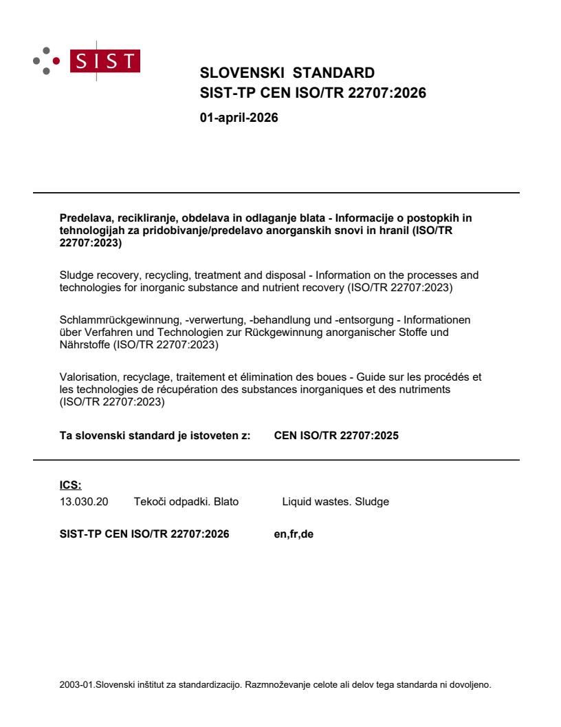 SIST-TP CEN ISO/TR 22707:2026 is a technical report published by the Slovenian Institute for Standardization (SIST). Its full title is "Sludge recovery, recycling, treatment and disposal - Information on the processes and technologies for inorganic substance and nutrient recovery (ISO/TR 22707:2023)". This standard covers: This document provides information on the processes and technologies for inorganic substance and nutrient recovery from sludge. This document is applicable to sludge and products from urban wastewater collection systems, night soil, wastewater treatment plants for urban and similar industrial waters. It includes all sludge that can have either similar environmental or health impacts, or both. Hazardous sludge from industry and dredged sludge are excluded from this document.
